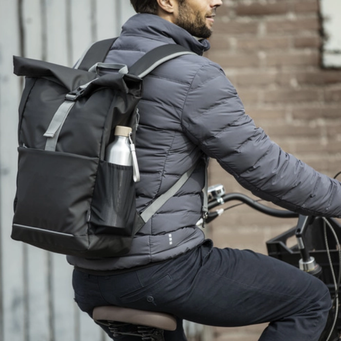 Sodobni kolesarski nahrbtniki z roll-top zapiranjem in nastavki za pritrditev na kolo združujejo funkcionalnost in zanesljivo zaščito vsebine. Idealni so za vsakodnevne poti v službo, na sestanke ali po opravkih – na kolesu ali peš. Z možnostjo dotiska logotipa postanejo prepoznaven promocijski izdelek, ki vašo blagovno znamko postavi v aktiven, moderen kontekst. Uporaben vsak dan. S posebnimi nastavki, s pomočjo katerih jih lahko namestimo na okvir kolesa. Narejeni so lahko tudi iz nepremočljivih materialov.