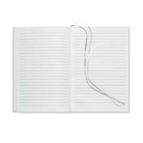 A5 journal notebook in 60% recycled post consumer polyester and 40% PU cover. Casebound. 256 lined pages in 70gsm recycled paper (128 sheets). With 2 polyester ribbon page markers.