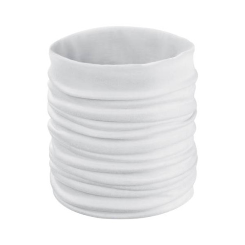 Bela bandana iz 100% poliestra. Mogoč je sublimacijski tisk v full-color tehniki. Služi lahko tudi kot zaščitna maska.