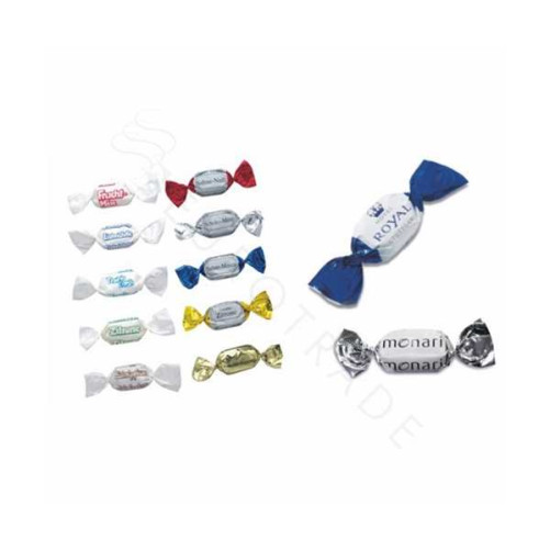 Zaviti v metalni ovitek z belim prostorom za tisk. Ovitek v 5-ih barvah, bonboni v 20-ih okusih. Velikost: ca. 7 x 1,2 x 1,7 cm. Minimalna količina: 1-3 barvni tisk od 25 kg, 4 barvni tisk od 200 kg (brez polnila: 1 kg = ca. 210 bonbonov; polnjeni: 1 kg = 170 bonbonov). Prostor za tisk: ca. 2,4 x 2 cm. Cena velja za kg.minimalna količina - 25kg