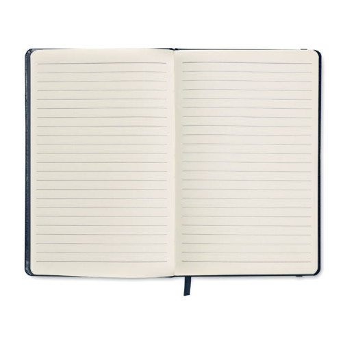 A5 notebook with hard PU cover. Casebound. 192 lined recycled paper pages (96 sheets). Matching elastic closure strap and ribbon page-marker. FSC®-certified