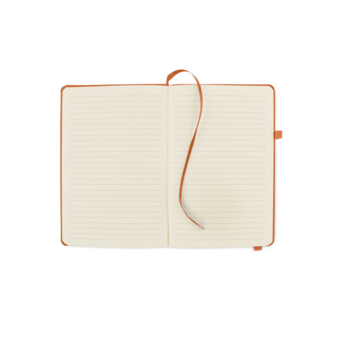 A5 notebook with 70% recycled pre-consumer leather and 30% latex PU cover. Casebound. 192 lined pages recycled paper (96 sheets). Matching cotton elastic closure strap and pen holder.