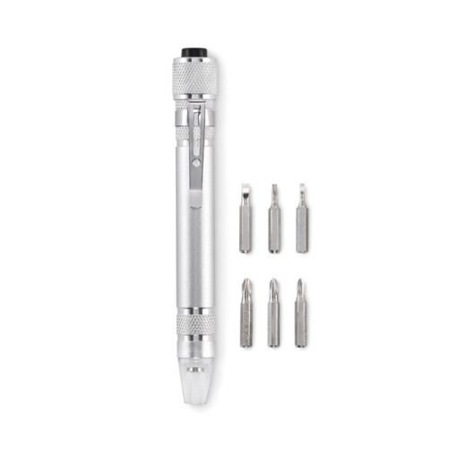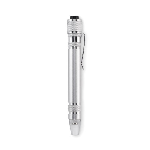 Recycled aluminium multi tool in pen shape with torch. Includes 3 slotted and 3 Phillips screwdriver heads. 4 button cell LR41 batteries included.