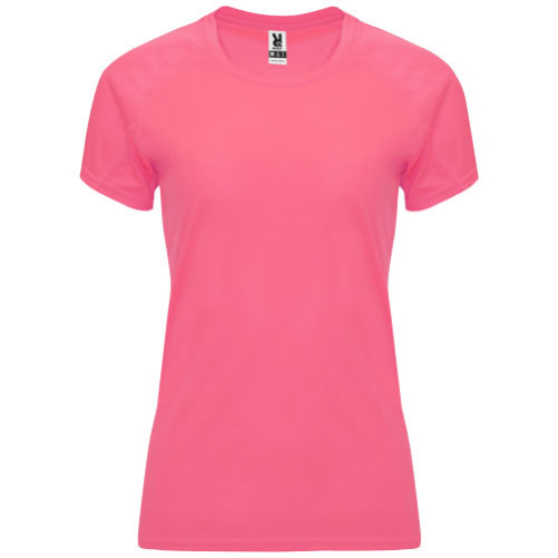 Ženska športna majica s kratkimi rokavi in okroglim ovratnikom z ujemajočimi se pokritimi šivi. Blago, ki diha, je enostavno za pranje in sušenje. 100% poliester, 135 g/m2